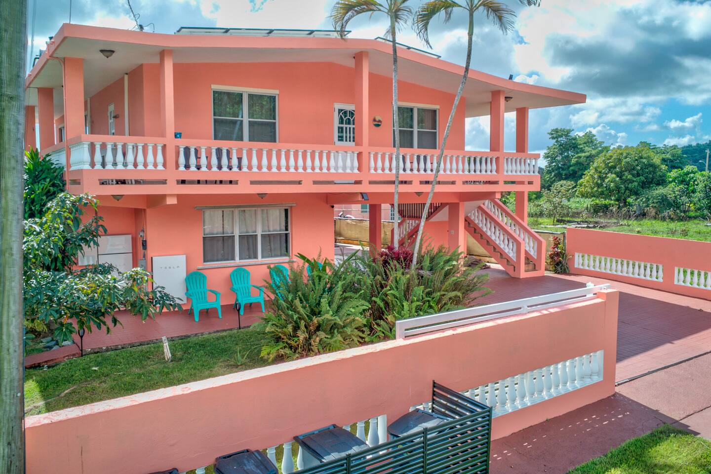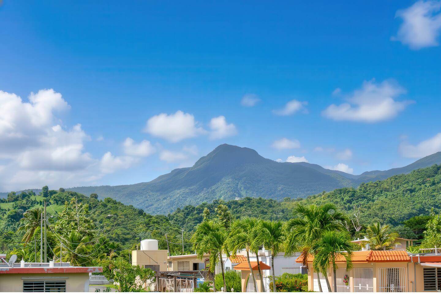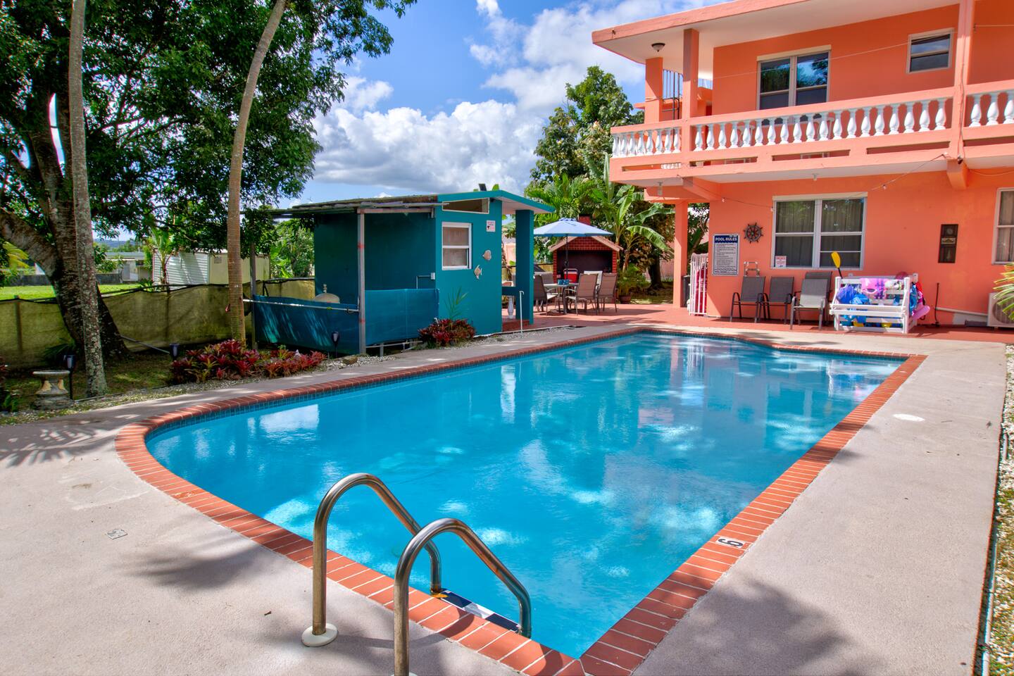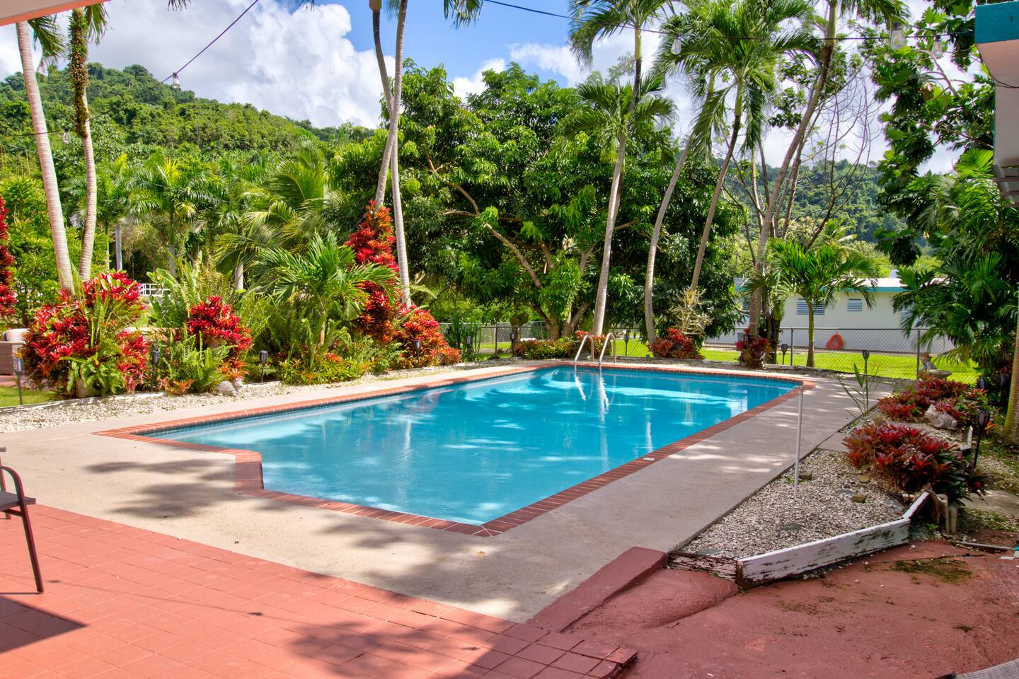 Wake up to a new day with roosters and birdsongs. Take a moment to admire Mother Nature from the balcony. The tall mountains at the horizon are part of the National Rain Forest El Yunque's south side. Driving in, you'll leave the highway to take a narrow road between cattle and plantain fields. Be amazed by the green mountains on whose skirt this community is nestled. It's a short drive to the house. What makes this property unique is the way it's divided. You'll have 3 separate units for your group, providing more privacy for family circles. The space is divided as follows: On the first floor you'll find two independent units, each with one bedroom, one bathroom, a kitchen, a dining area, and a living room with a TV. A/C in the bedrooms. Laundry area on the patio area. Unit A accommodates 4 guests Unit B, 2 guests. The second floor is a 3-bedroom/2-bath house with sleeping space for 7 guests. Enjoy A/C's in all rooms and common areas. You'll be surprised by the ample space, tall ceilings, all around balcony, and new kitchen appliances. Space inside includes a dining room and a living room with a smart TV. Another laundry area can be found on the balcony towards the back. A carport with space for 2-3 vehicles will have them accessible. Patio with big pool, BBQ, seating areas, outdoor shower, and half bathroom. Ample grass area with tropical plants and trees, including avocado, sugarcane, breadfruit, plantains, papaya, "quenepas" and other fruit trees. Know that this property is rented for a single group. You will not be sharing the space with anyone else outside your group. Did you know you can cross Puerto Rico from the east to the west in only 3 hours? Our guidebook will give you ideas of what to do around the area and even a bit further. Explore the opportunity to visit places of interest around Puerto Rico during the day, knowing you will return to a clean and comfortable place to rest.