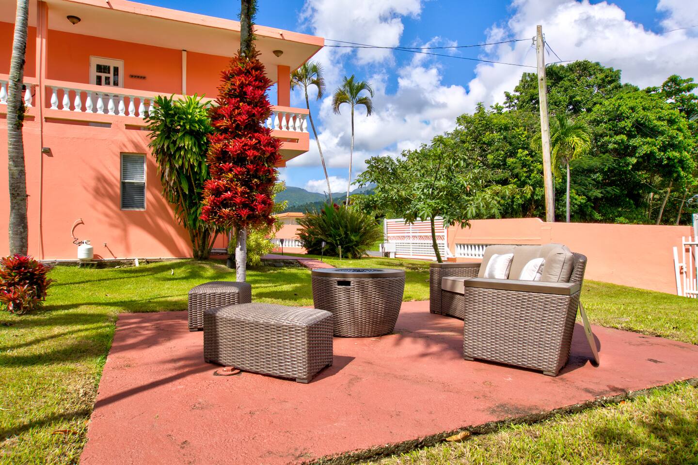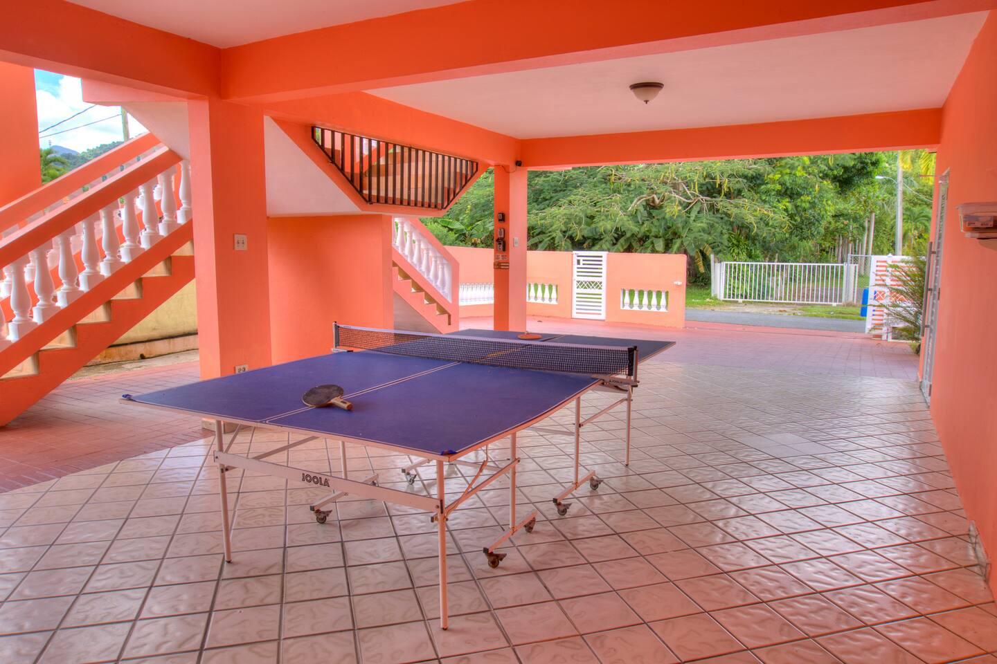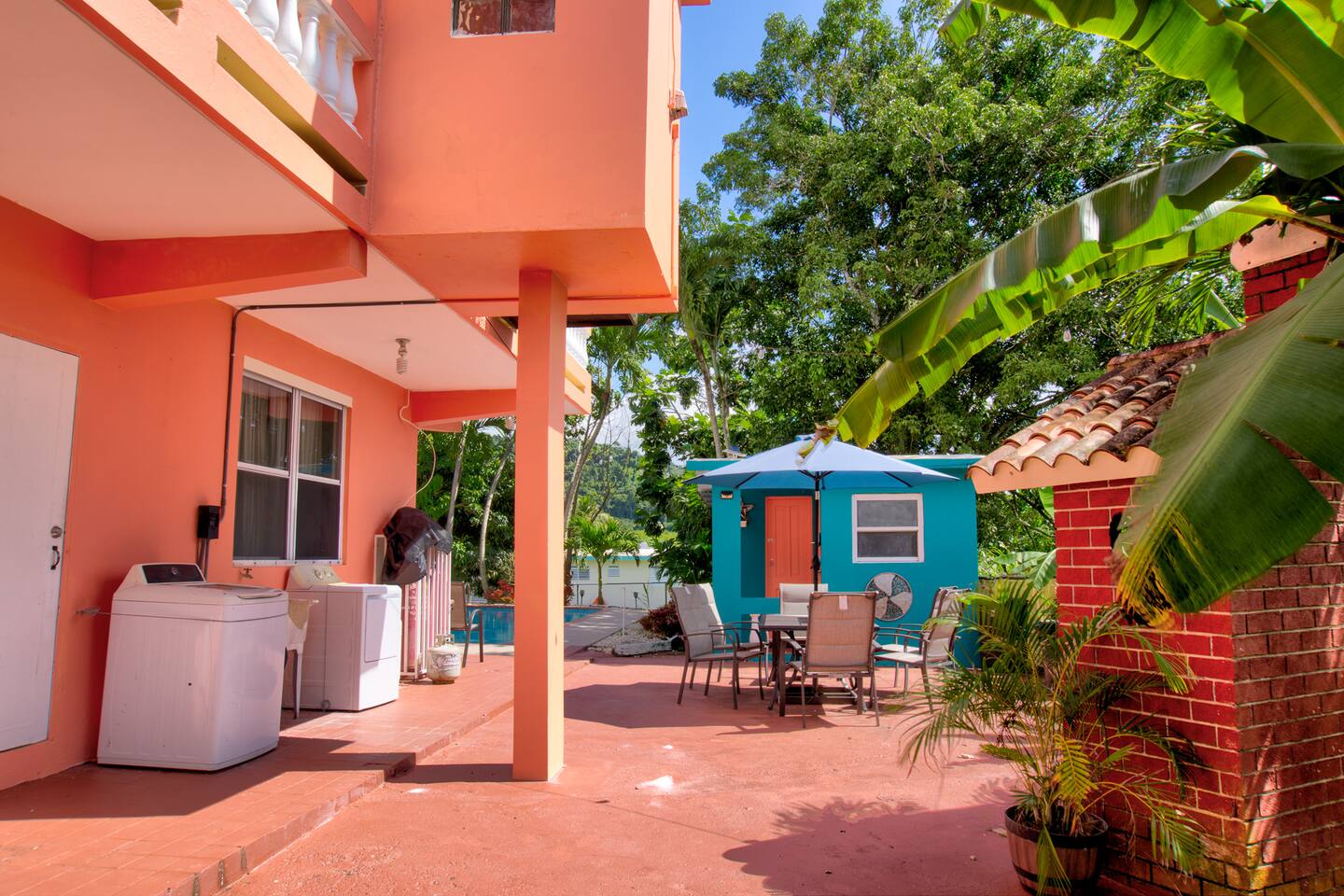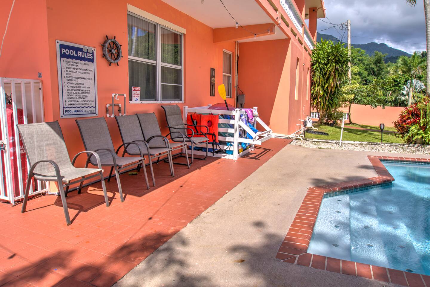 Wake up to a new day with roosters and birdsongs. Take a moment to admire Mother Nature from the balcony. The tall mountains at the horizon are part of the National Rain Forest El Yunque's south side. Driving in, you'll leave the highway to take a narrow road between cattle and plantain fields. Be amazed by the green mountains on whose skirt this community is nestled. It's a short drive to the house. What makes this property unique is the way it's divided. You'll have 3 separate units for your group, providing more privacy for family circles. The space is divided as follows: On the first floor you'll find two independent units, each with one bedroom, one bathroom, a kitchen, a dining area, and a living room with a TV. A/C in the bedrooms. Laundry area on the patio area. Unit A accommodates 4 guests Unit B, 2 guests. The second floor is a 3-bedroom/2-bath house with sleeping space for 7 guests. Enjoy A/C's in all rooms and common areas. You'll be surprised by the ample space, tall ceilings, all around balcony, and new kitchen appliances. Space inside includes a dining room and a living room with a smart TV. Another laundry area can be found on the balcony towards the back. A carport with space for 2-3 vehicles will have them accessible. Patio with big pool, BBQ, seating areas, outdoor shower, and half bathroom. Ample grass area with tropical plants and trees, including avocado, sugarcane, breadfruit, plantains, papaya, "quenepas" and other fruit trees. Know that this property is rented for a single group. You will not be sharing the space with anyone else outside your group. Did you know you can cross Puerto Rico from the east to the west in only 3 hours? Our guidebook will give you ideas of what to do around the area and even a bit further. Explore the opportunity to visit places of interest around Puerto Rico during the day, knowing you will return to a clean and comfortable place to rest.