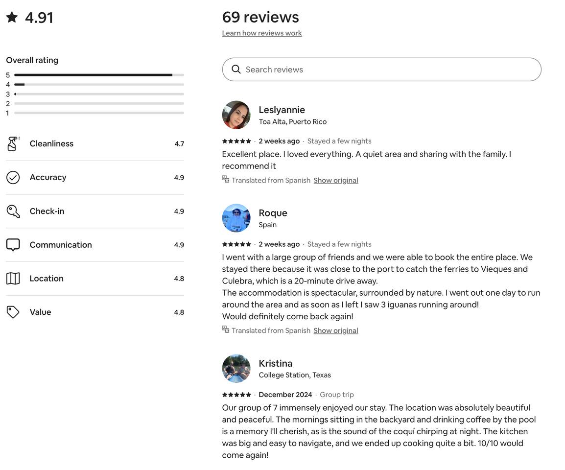 This is not a new property listing. The previous owner sold the property on 4/8/25, and they owned the previous listing. Now it is exactly the same property, with the same amenities and the same property management team. 4.91 stars with 69 reviews. We included a screenshot for reference, transparency, and accuracy. A car is needed, as Uber service or public transportation is very limited—or nonexistent—in this area. Our property is on the process of being painted and updated. The pictures will be available soon- but all accommodations stays the same. Early check-in and/or late checkout can be offered for a fee, based on availability. Garbage is picked up on Wednesday. Solar panels with Tesla batteries for power backup. This means that on the event of power loss, we will ask you to turn all A/C off to extend the life of the batteries. This is a country area and part of the beauty is the environment. Wind and leaves affect the pool. Something we cannot control. Coquis, iguanas, frogs, birds, lizards and others are commonly found in the property. We understand that travel plans can change unexpectedly. To protect your trip and avoid losing your payment in the event of cancellation outside the free cancellation period, we recommend purchasing travel insurance, which usually costs a fraction of the cost of your booking. If necessary, we will assist you with the documentation on our end.