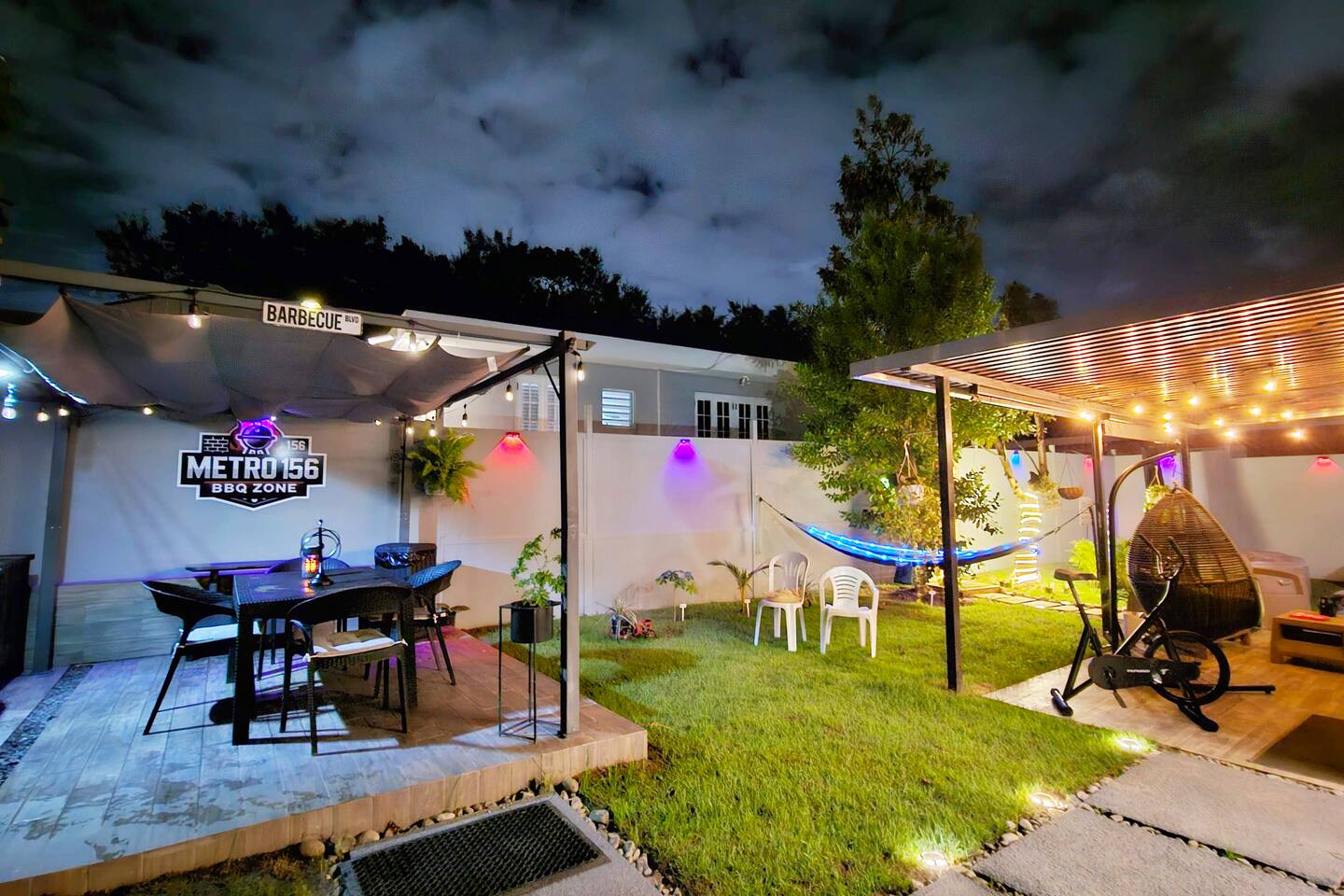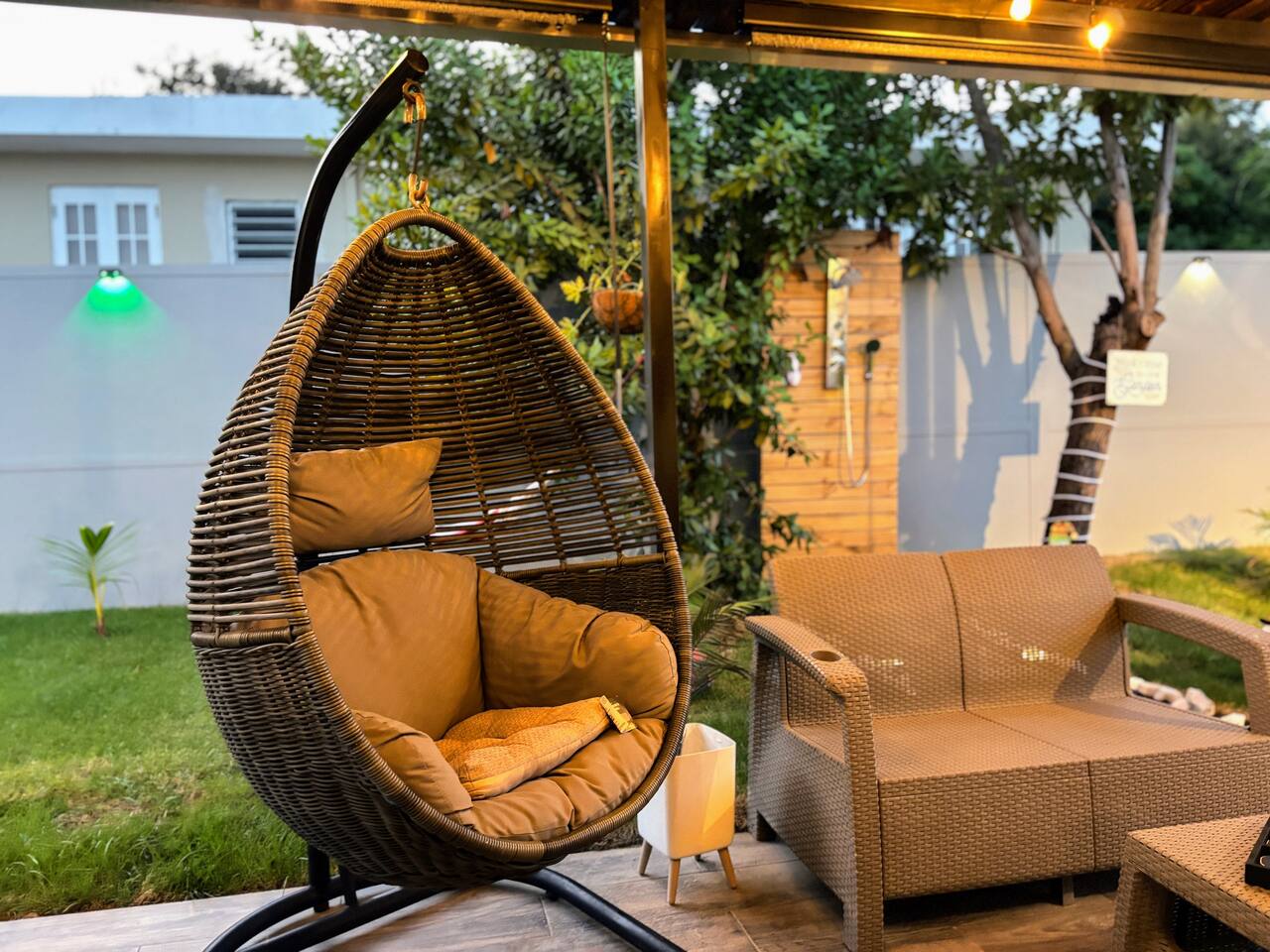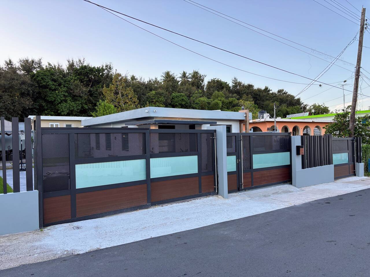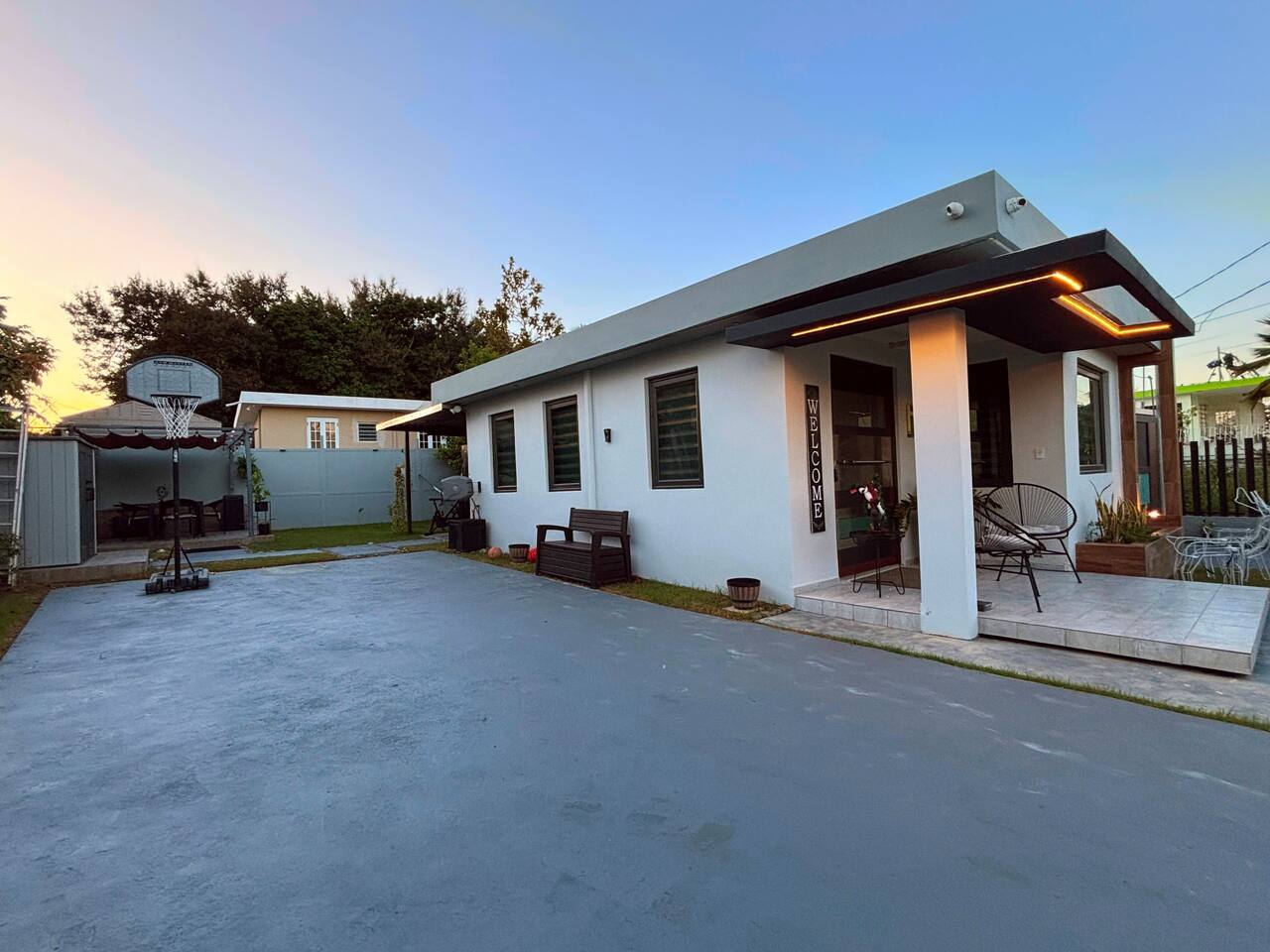 Welcome to "Outdoor Haven," a retreat right in the heart of the metropolitan area. This home is designed to maximize your enjoyment of the outdoors, offering comfort, style, and unforgettable experiences. Step into relaxation with two inviting seating areas: one under a shaded terrace equipped with a TV, ambient lighting, and a cooler, and another featuring a retractable shade, fire pit, and smart projector for seamless streaming. Whether you’re soaking in the jacuzzi, shaded or under the stars, or rinsing off in the outdoor shower, every moment is crafted for your ultimate comfort. Ready to test your grilling skills? The pergola terrace is your perfect outdoor kitchen, complete with a gas BBQ, sink, counters, and storage, all conveniently located near a dining table where cherished memories are made. Enjoy meals under retractable shades or the open sky, surrounded by lush ambiance. Don't stop your exercise routine. Play basketball in our basketball area and use our stationary bike to keep that heart in shape. Inside, the house offers modern tech and thoughtfully curated lighting throughout the property. The interior is designed to impress, with every detail tailored to create a sense of awe. Fully air-conditioned, the home features two bedrooms with full-size beds, a beautifully remodeled bathroom, and a functional, stylish kitchen. Each bedroom and the family room is equipped with TVs, ensuring comfort and entertainment for all. The kitchen includes everything you need to host up to four guests: a two-burner electric stove, microwave, full-size refrigerator, counter space, utensils, and dinnerware. The master bedroom provides direct access to the stunningly remodeled bathroom, blending beauty and practicality. The second bedroom features a compact workspace with a desk, chair, and keyboard for your convenience. This house comes with an electric power generator to guarantee the service all the time. Conveniently located, *Outdoor Haven* puts you close to everything you need: - 8 minutes from SJU Airport - 7 minutes from The Mall of San Juan - 5 minutes from El Escorial Shopping Center - 9 minutes from Isla Verde Beach - 20 minutes from Old San Juan - 1 hr from El Yunque