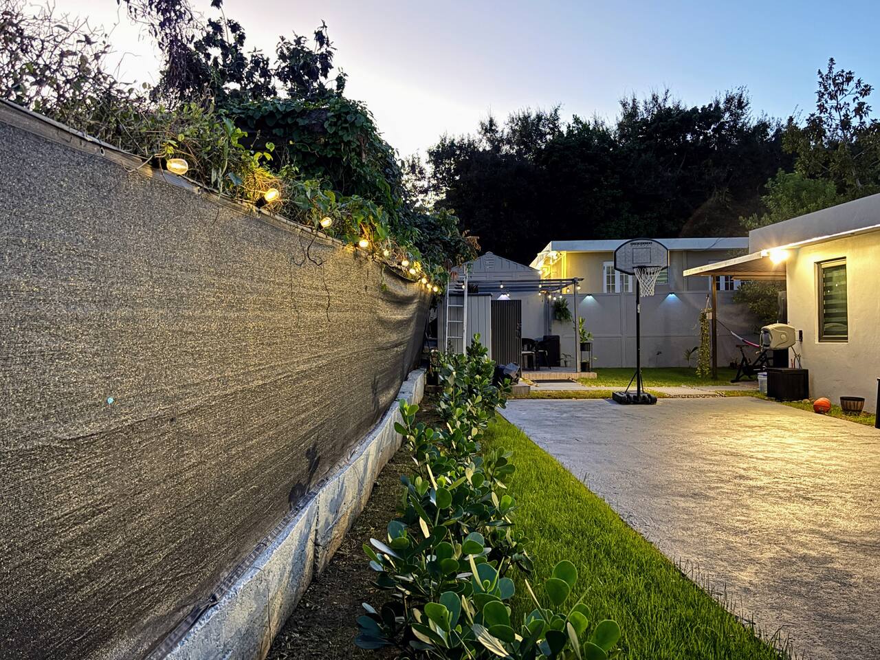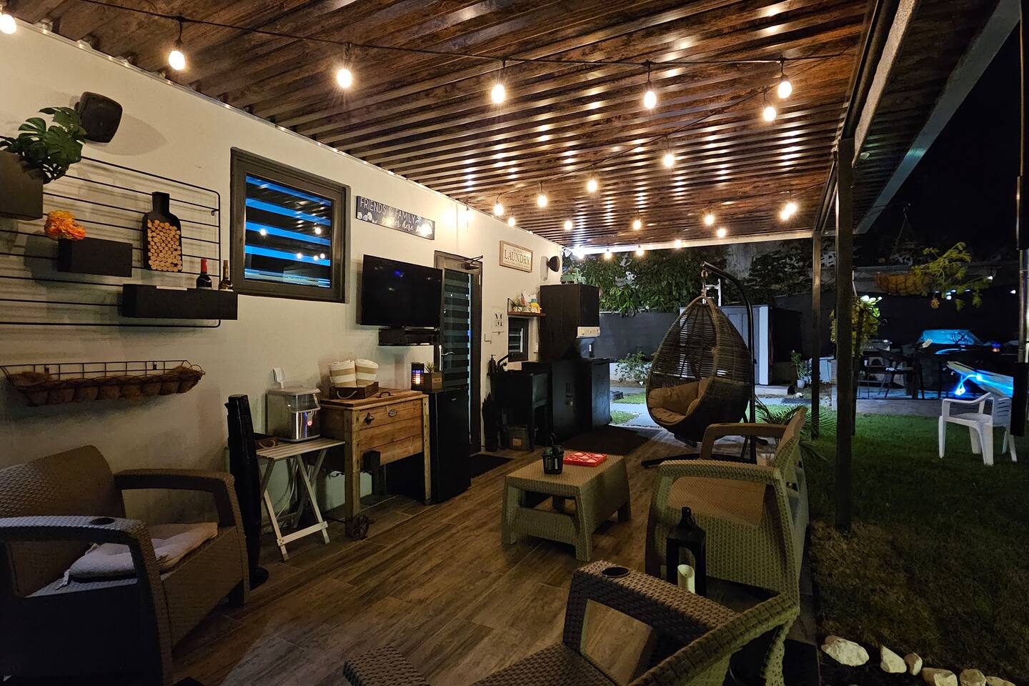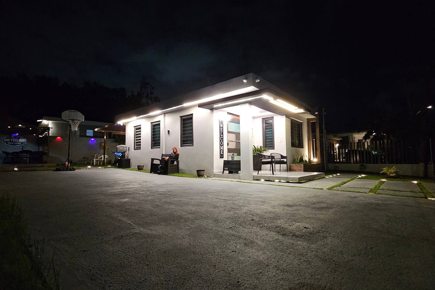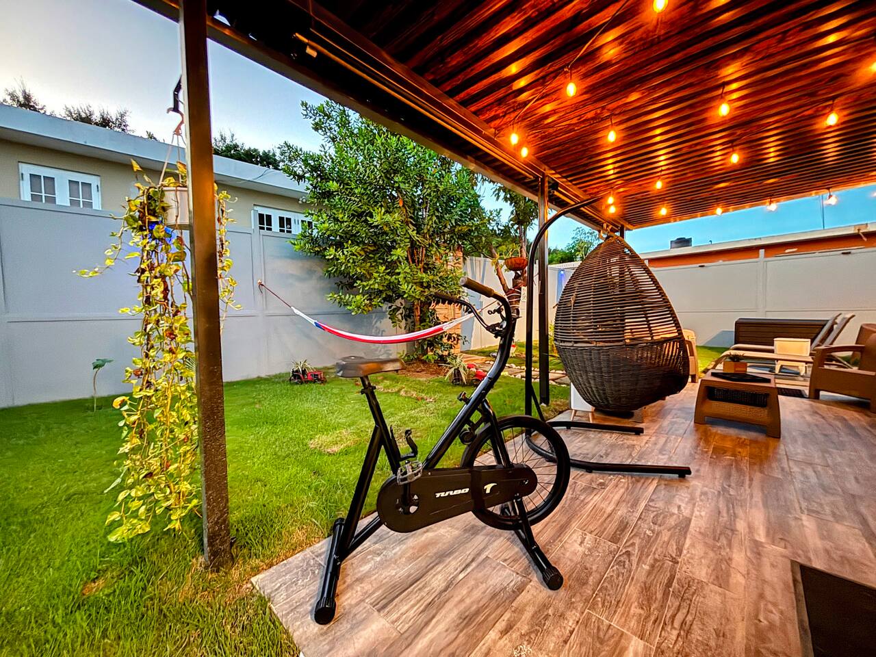 Welcome to "Outdoor Haven," a retreat right in the heart of the metropolitan area. This home is designed to maximize your enjoyment of the outdoors, offering comfort, style, and unforgettable experiences. Step into relaxation with two inviting seating areas: one under a shaded terrace equipped with a TV, ambient lighting, and a cooler, and another featuring a retractable shade, fire pit, and smart projector for seamless streaming. Whether you’re soaking in the jacuzzi, shaded or under the stars, or rinsing off in the outdoor shower, every moment is crafted for your ultimate comfort. Ready to test your grilling skills? The pergola terrace is your perfect outdoor kitchen, complete with a gas BBQ, sink, counters, and storage, all conveniently located near a dining table where cherished memories are made. Enjoy meals under retractable shades or the open sky, surrounded by lush ambiance. Don't stop your exercise routine. Play basketball in our basketball area and use our stationary bike to keep that heart in shape. Inside, the house offers modern tech and thoughtfully curated lighting throughout the property. The interior is designed to impress, with every detail tailored to create a sense of awe. Fully air-conditioned, the home features two bedrooms with full-size beds, a beautifully remodeled bathroom, and a functional, stylish kitchen. Each bedroom and the family room is equipped with TVs, ensuring comfort and entertainment for all. The kitchen includes everything you need to host up to four guests: a two-burner electric stove, microwave, full-size refrigerator, counter space, utensils, and dinnerware. The master bedroom provides direct access to the stunningly remodeled bathroom, blending beauty and practicality. The second bedroom features a compact workspace with a desk, chair, and keyboard for your convenience. This house comes with an electric power generator to guarantee the service all the time. Conveniently located, *Outdoor Haven* puts you close to everything you need: - 8 minutes from SJU Airport - 7 minutes from The Mall of San Juan - 5 minutes from El Escorial Shopping Center - 9 minutes from Isla Verde Beach - 20 minutes from Old San Juan - 1 hr from El Yunque