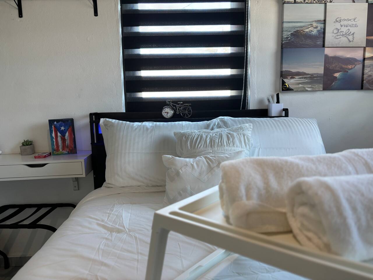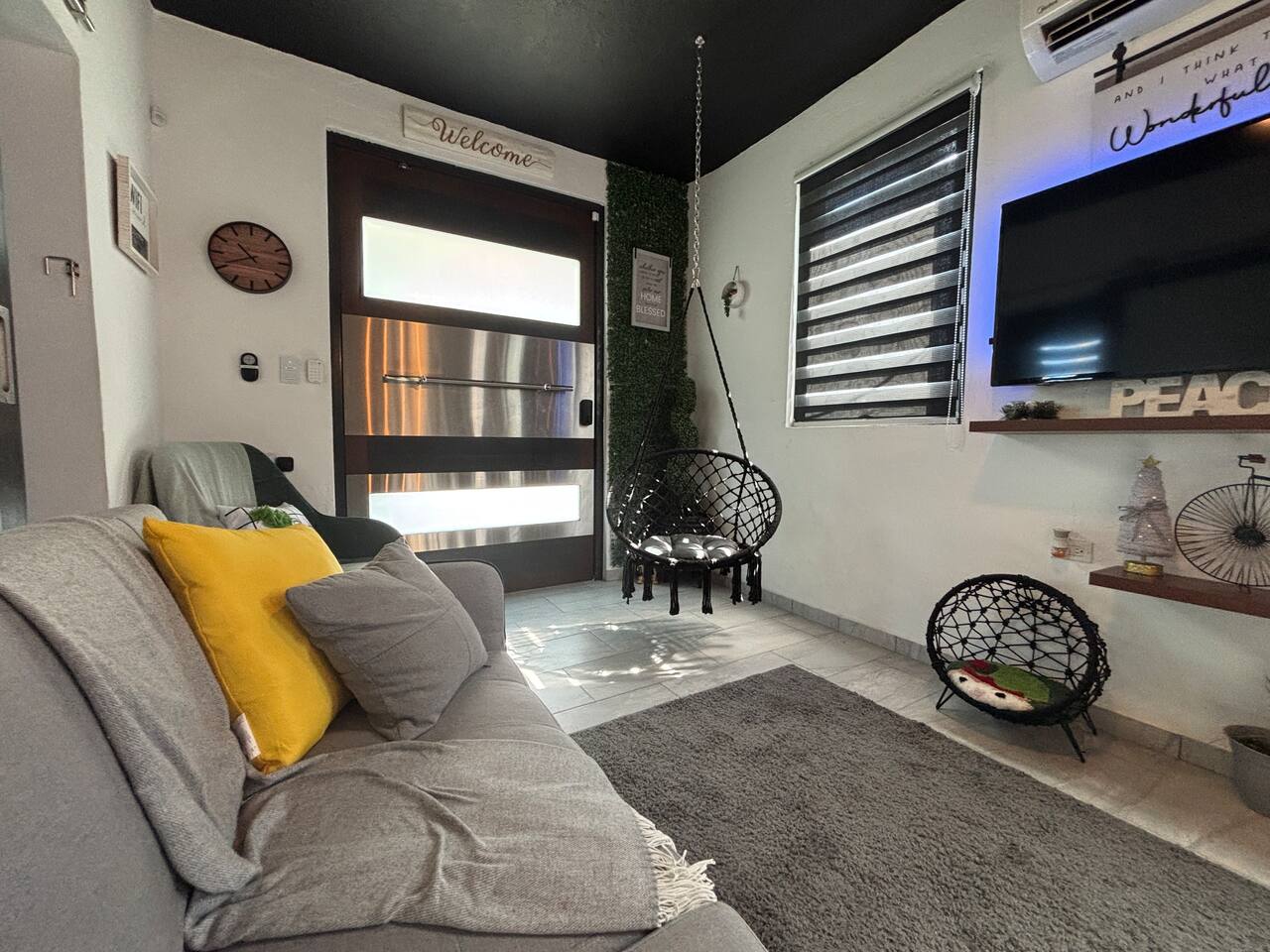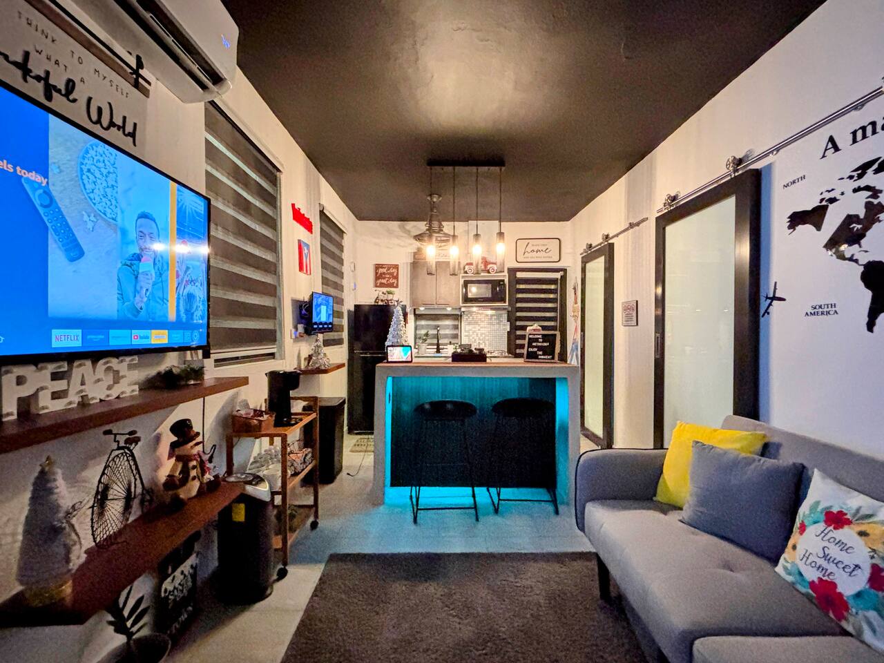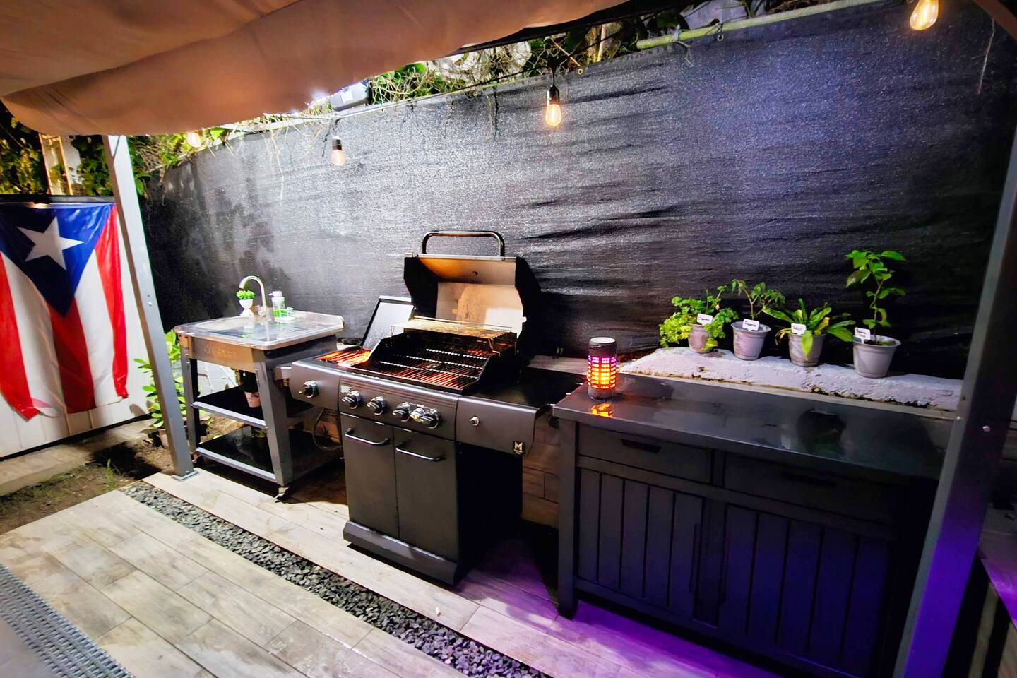 Welcome to "Outdoor Haven," a retreat right in the heart of the metropolitan area. This home is designed to maximize your enjoyment of the outdoors, offering comfort, style, and unforgettable experiences. Step into relaxation with two inviting seating areas: one under a shaded terrace equipped with a TV, ambient lighting, and a cooler, and another featuring a retractable shade, fire pit, and smart projector for seamless streaming. Whether you’re soaking in the jacuzzi, shaded or under the stars, or rinsing off in the outdoor shower, every moment is crafted for your ultimate comfort. Ready to test your grilling skills? The pergola terrace is your perfect outdoor kitchen, complete with a gas BBQ, sink, counters, and storage, all conveniently located near a dining table where cherished memories are made. Enjoy meals under retractable shades or the open sky, surrounded by lush ambiance. Don't stop your exercise routine. Play basketball in our basketball area and use our stationary bike to keep that heart in shape. Inside, the house offers modern tech and thoughtfully curated lighting throughout the property. The interior is designed to impress, with every detail tailored to create a sense of awe. Fully air-conditioned, the home features two bedrooms with full-size beds, a beautifully remodeled bathroom, and a functional, stylish kitchen. Each bedroom and the family room is equipped with TVs, ensuring comfort and entertainment for all. The kitchen includes everything you need to host up to four guests: a two-burner electric stove, microwave, full-size refrigerator, counter space, utensils, and dinnerware. The master bedroom provides direct access to the stunningly remodeled bathroom, blending beauty and practicality. The second bedroom features a compact workspace with a desk, chair, and keyboard for your convenience. This house comes with an electric power generator to guarantee the service all the time. Conveniently located, *Outdoor Haven* puts you close to everything you need: - 8 minutes from SJU Airport - 7 minutes from The Mall of San Juan - 5 minutes from El Escorial Shopping Center - 9 minutes from Isla Verde Beach - 20 minutes from Old San Juan - 1 hr from El Yunque