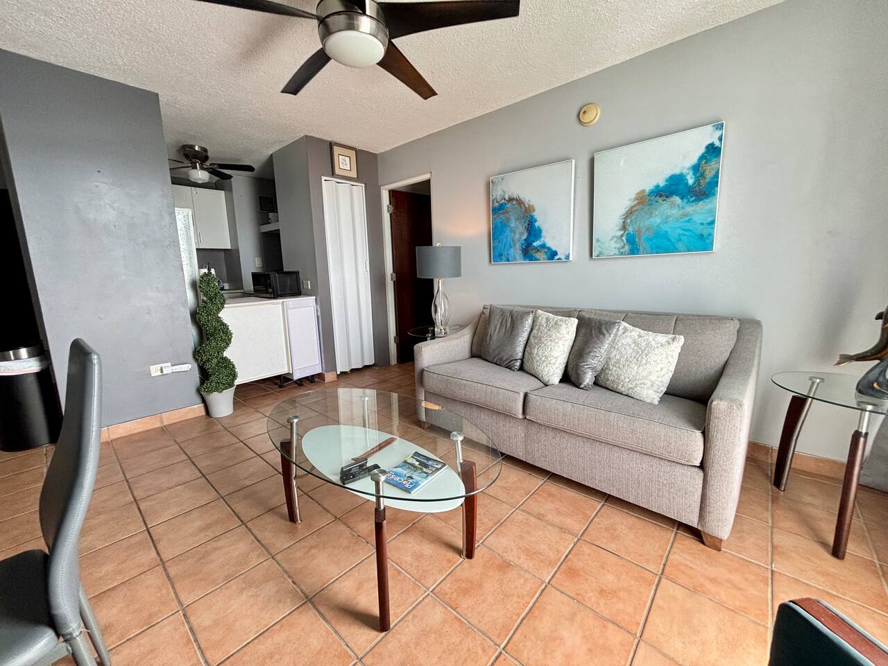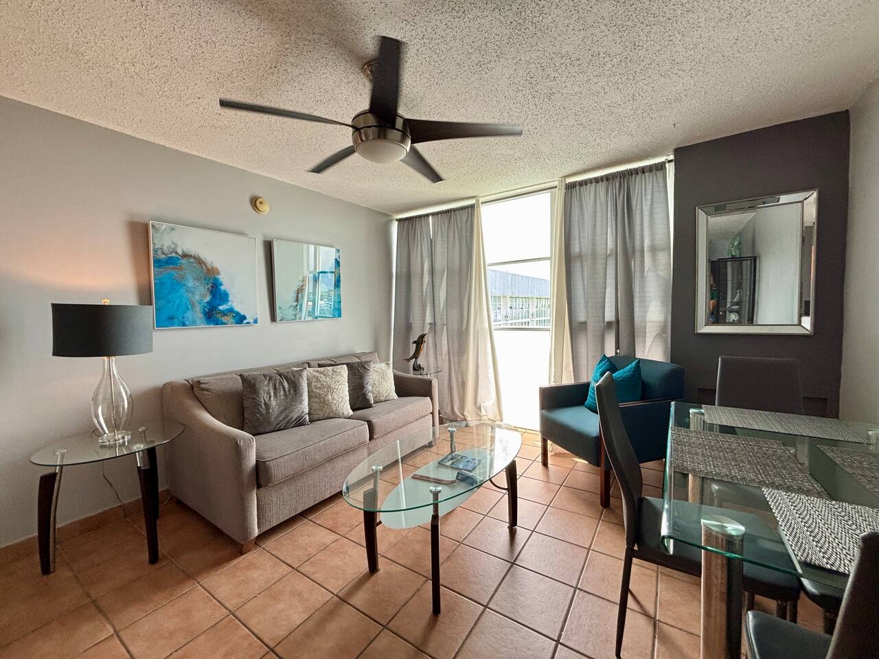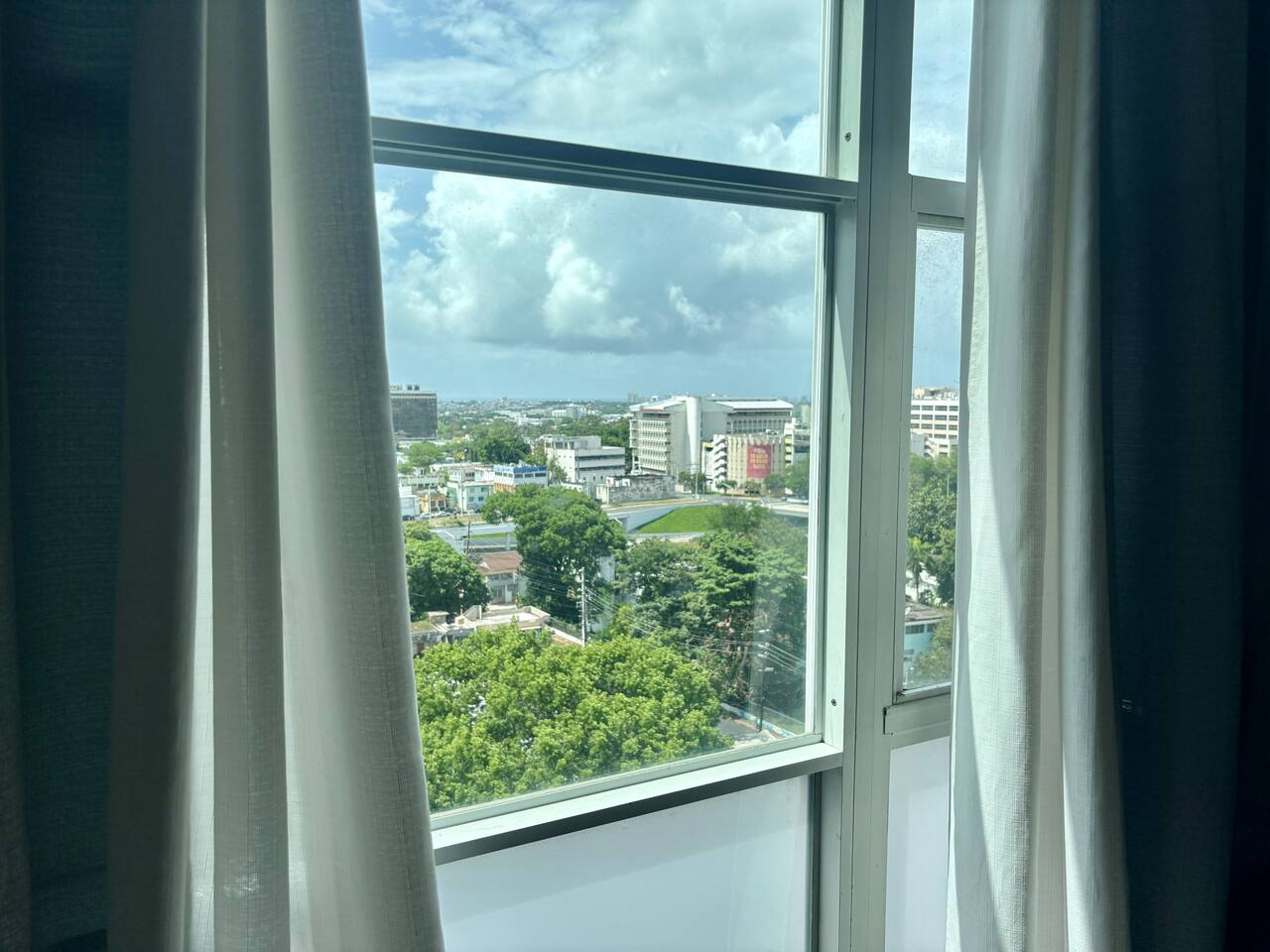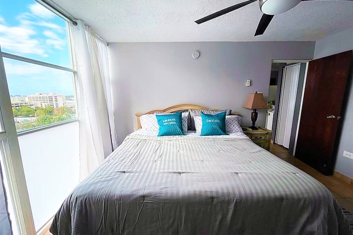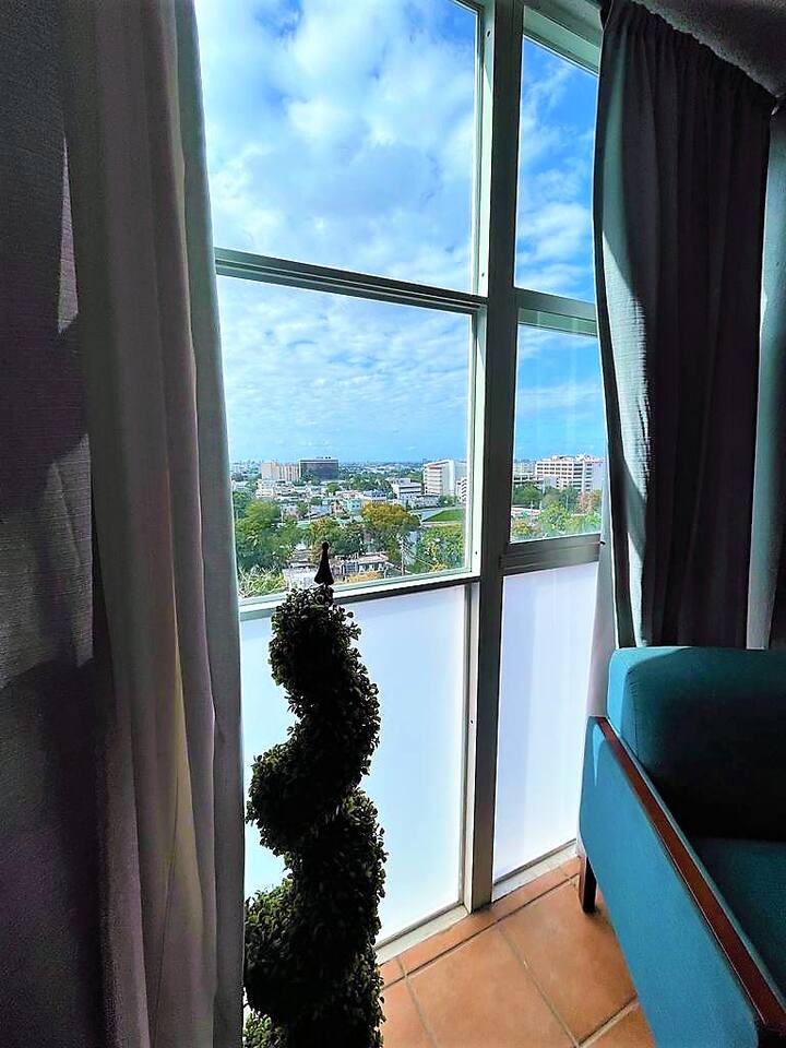Location, location, location! This fresh and bright apartment on the 17th floor is perfectly situated to explore San Juan and Puerto Rico. Ideal for 1 or 2 guests, it also includes a sleeper sofa in the living room, allowing accommodation for up to 4 guests. The bedroom is spacious, featuring a king-size bed, a desk with a chair, a TV, and a window A/C unit. There's also a dehumidifier, an attached bathroom, a closet, and impressive views, all with access to Wi-Fi. The kitchen is fully equipped with a stove and oven, microwave, refrigerator, and free use of a washer and dryer (just bring your own detergent). The living room is furnished with a comfortable set of furniture (a sleeping sofa) and a dining table for 4 and offers stunning views of the surrounding area. Parking is assigned and indoors, keeping your car cool, and gated with 24/7 security. The location is within walking distance of the University of Puerto Rico, restaurants, public transportation, Auxilio Mutuo Hospital, gas stations, ATMs, banks, and more. A short drive takes you to San Juan, Luis Muñoz Marín International Airport, the Mall of San Juan, Choliseo, Plaza Las Américas, highways, beaches, and other attractions. Guest parking is available for up to 4 hours; after that, there's a $50 HOA fee, so make sure not to exceed the limit to avoid the fine! Boricua owned!