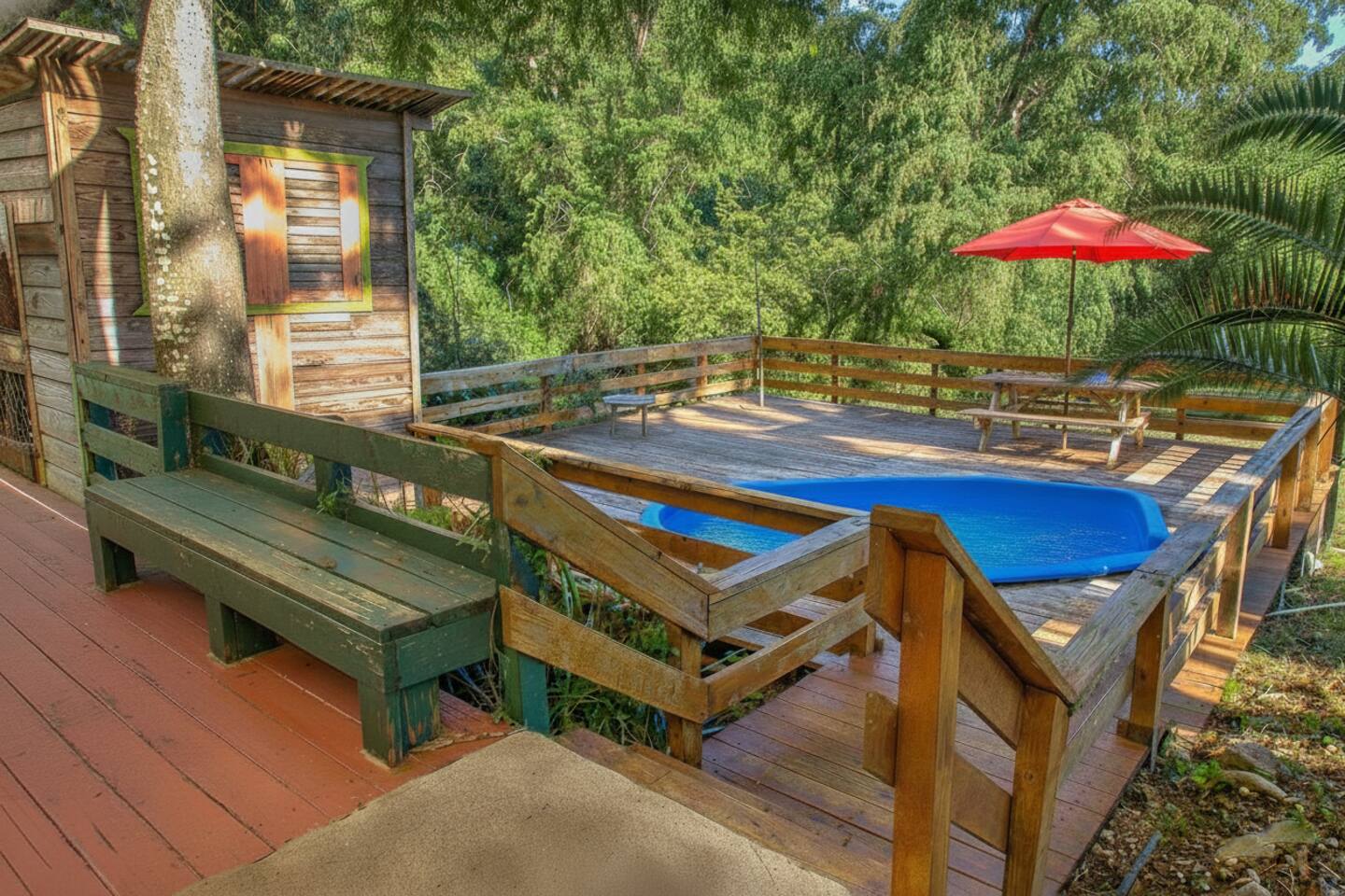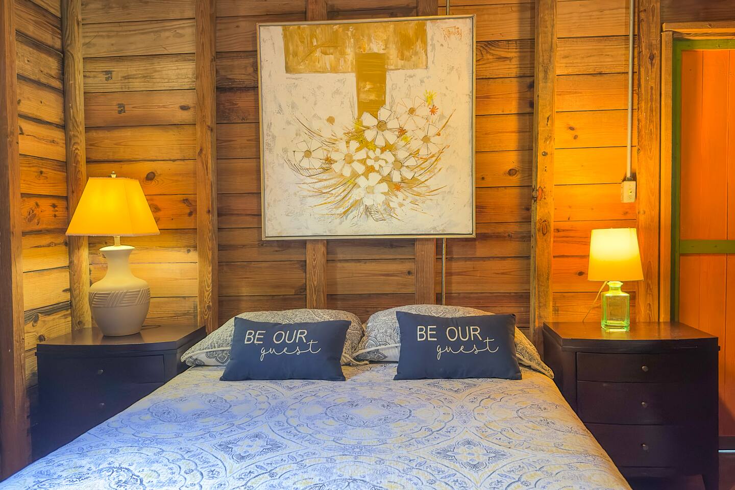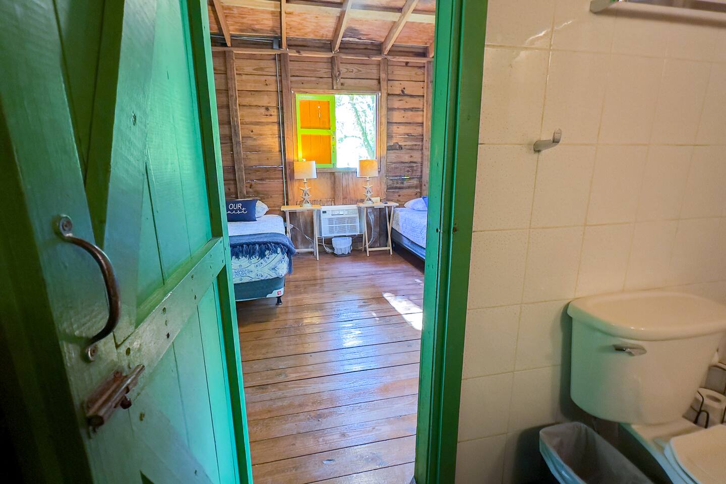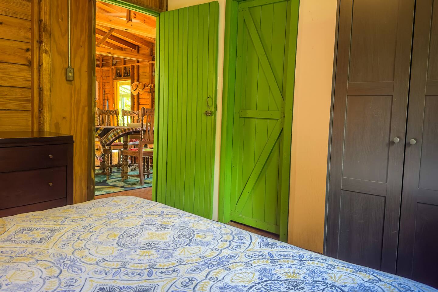 On this 161-acre Rancho Guayacán, Ceiba was the original cabin built at the property. Expect it to be rustic with great charm and the modern amenities we all enjoy, like wifi, TV, A/C in the bedrooms, full bathroom. Doors and window opens up the whole house. Close them at night for a complete black-out. Both bedrooms have fans and wall mounted air conditioning units. There is also a large fan in the main living and kitchen space. You will be greeted by a long covered front porch with rocking chairs- and probably by the horses and dogs too. a concrete patio two wooden decks under the trees. A small fiberglass (not heated) pool adds some sensory experience to your stay. It is separate from the other two homes (Aleli and Bambu) at the center of the farm.