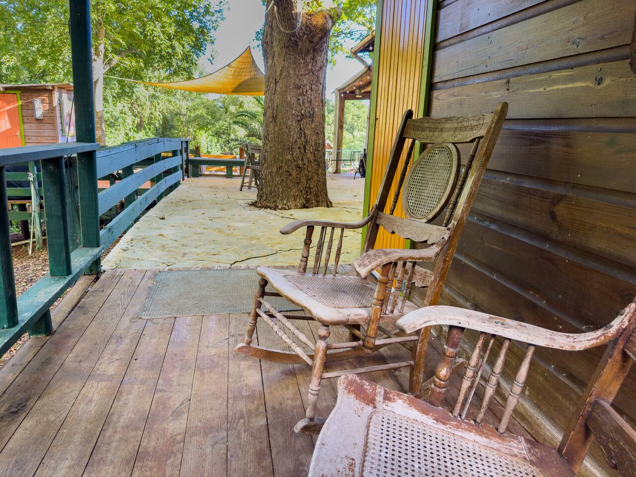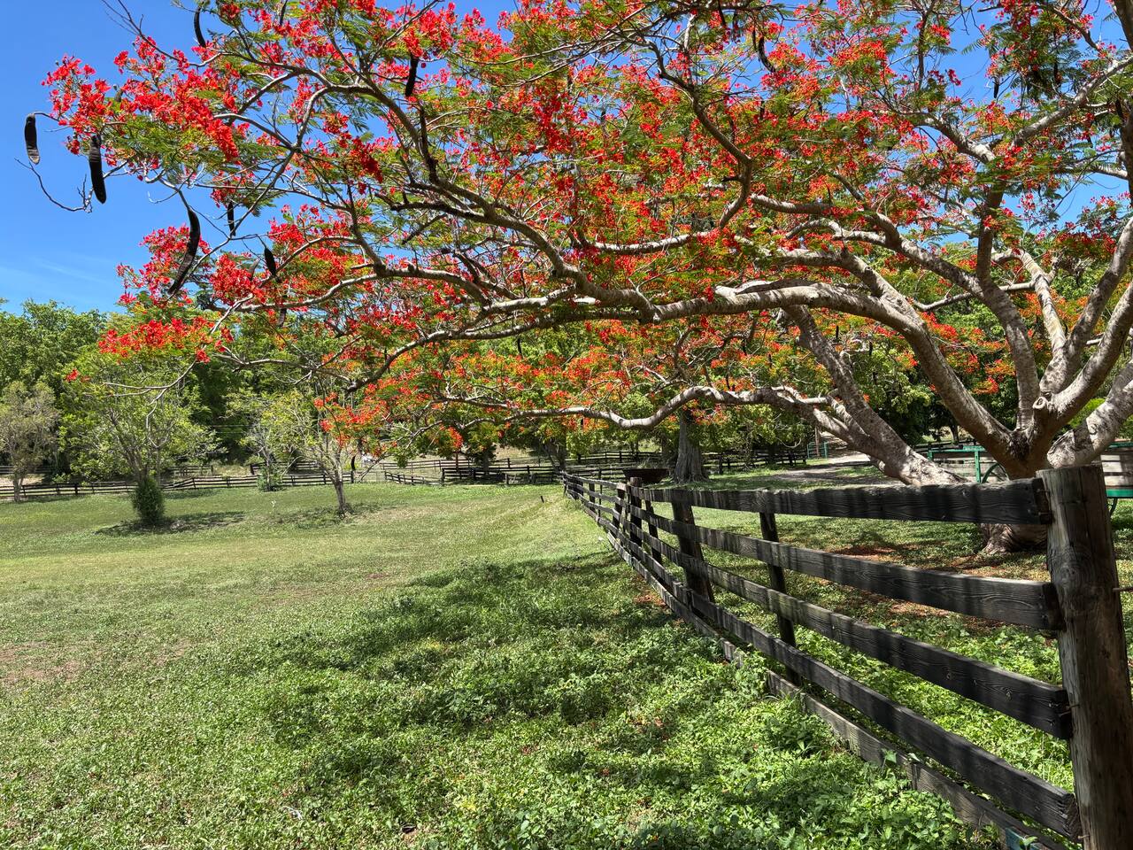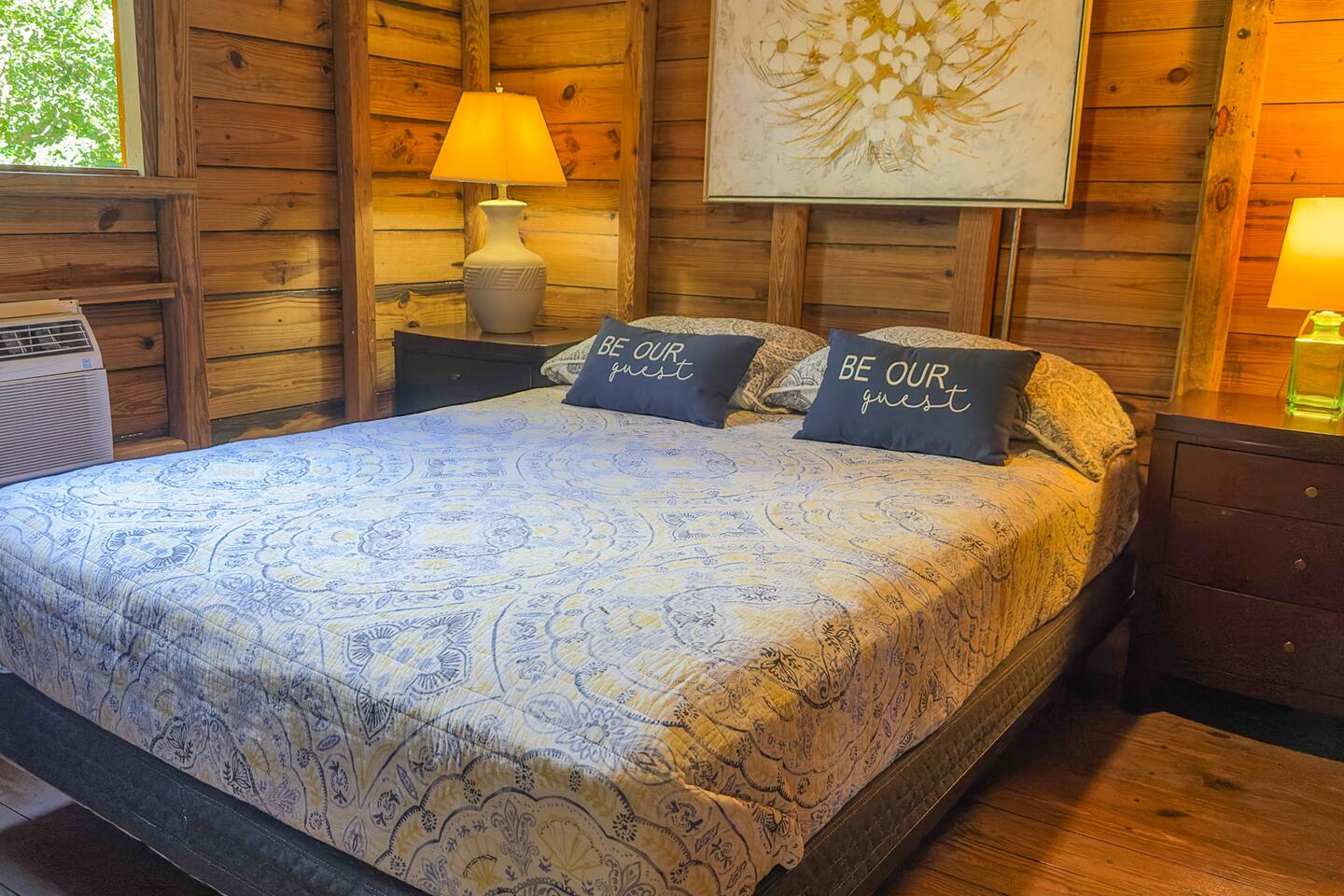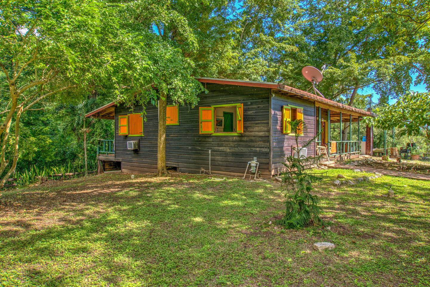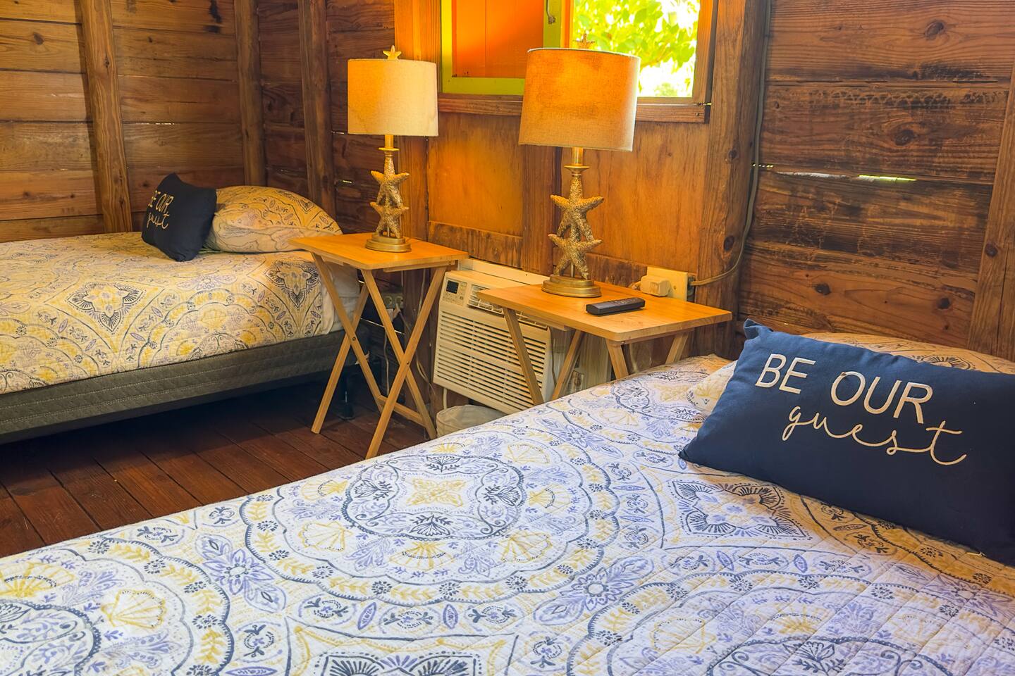 On this 161-acre Rancho Guayacán, Ceiba was the original cabin built at the property. Expect it to be rustic with great charm and the modern amenities we all enjoy, like wifi, TV, A/C in the bedrooms, full bathroom. Doors and window opens up the whole house. Close them at night for a complete black-out. Both bedrooms have fans and wall mounted air conditioning units. There is also a large fan in the main living and kitchen space. You will be greeted by a long covered front porch with rocking chairs- and probably by the horses and dogs too. a concrete patio two wooden decks under the trees. A small fiberglass (not heated) pool adds some sensory experience to your stay. It is separate from the other two homes (Aleli and Bambu) at the center of the farm.
