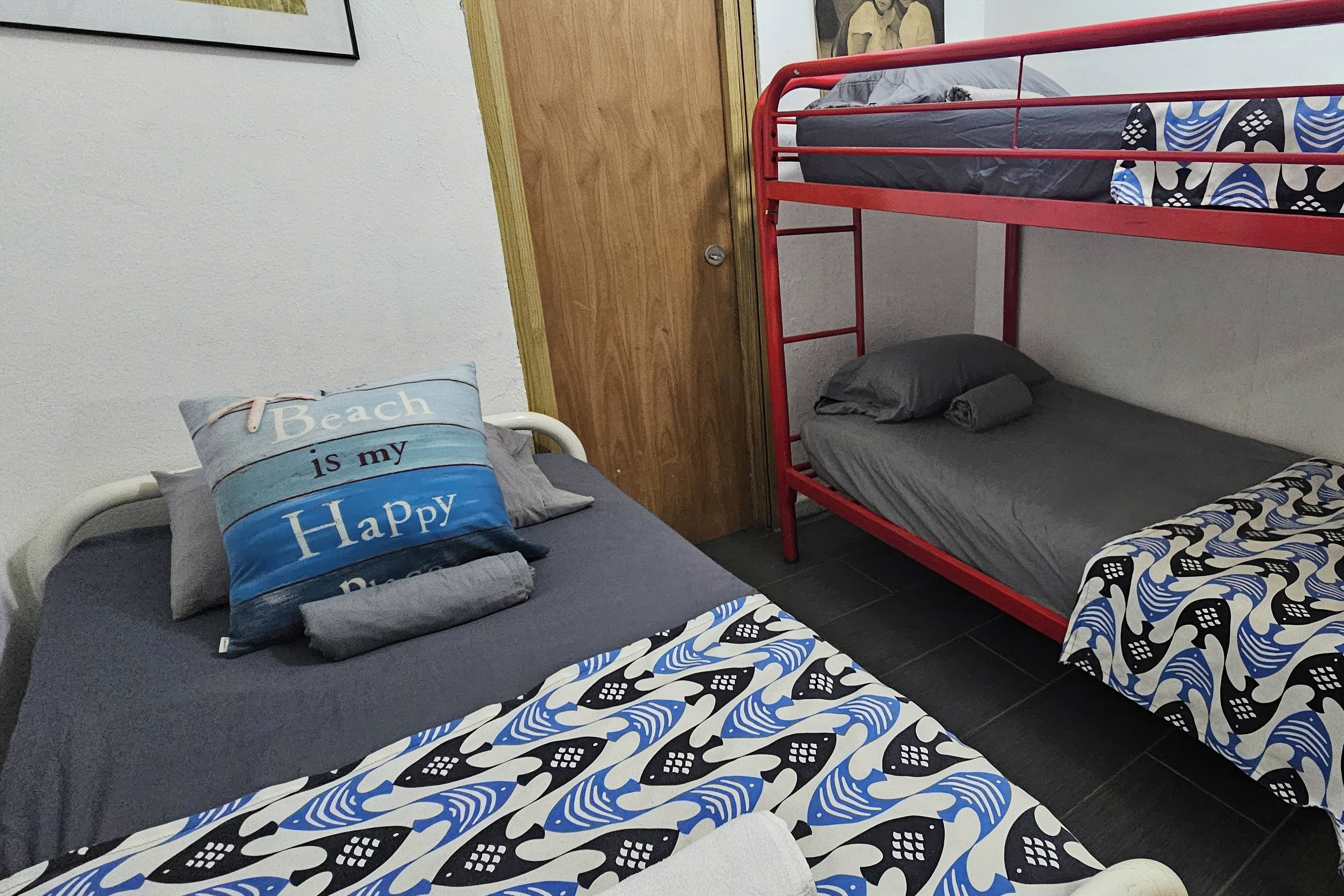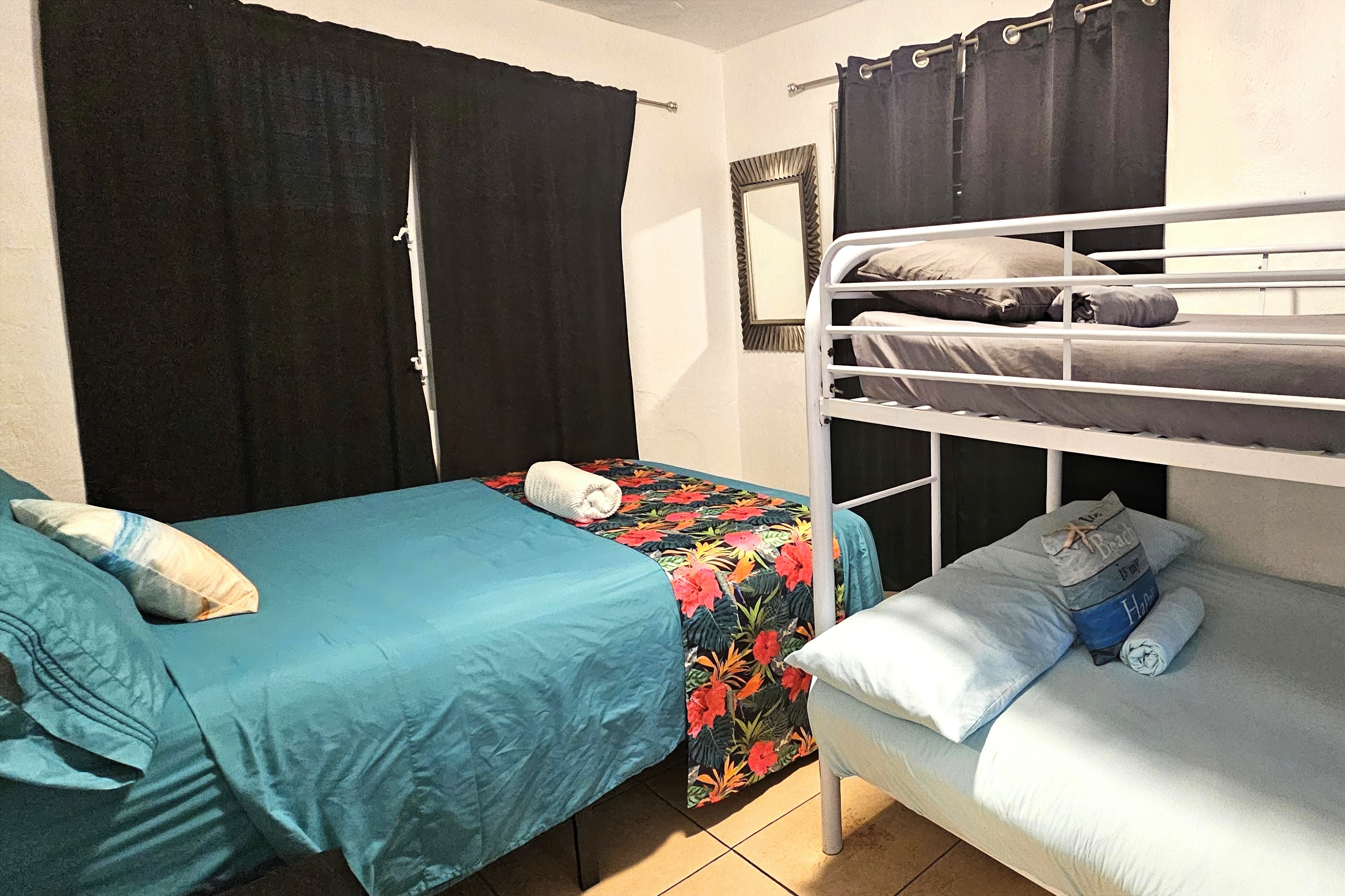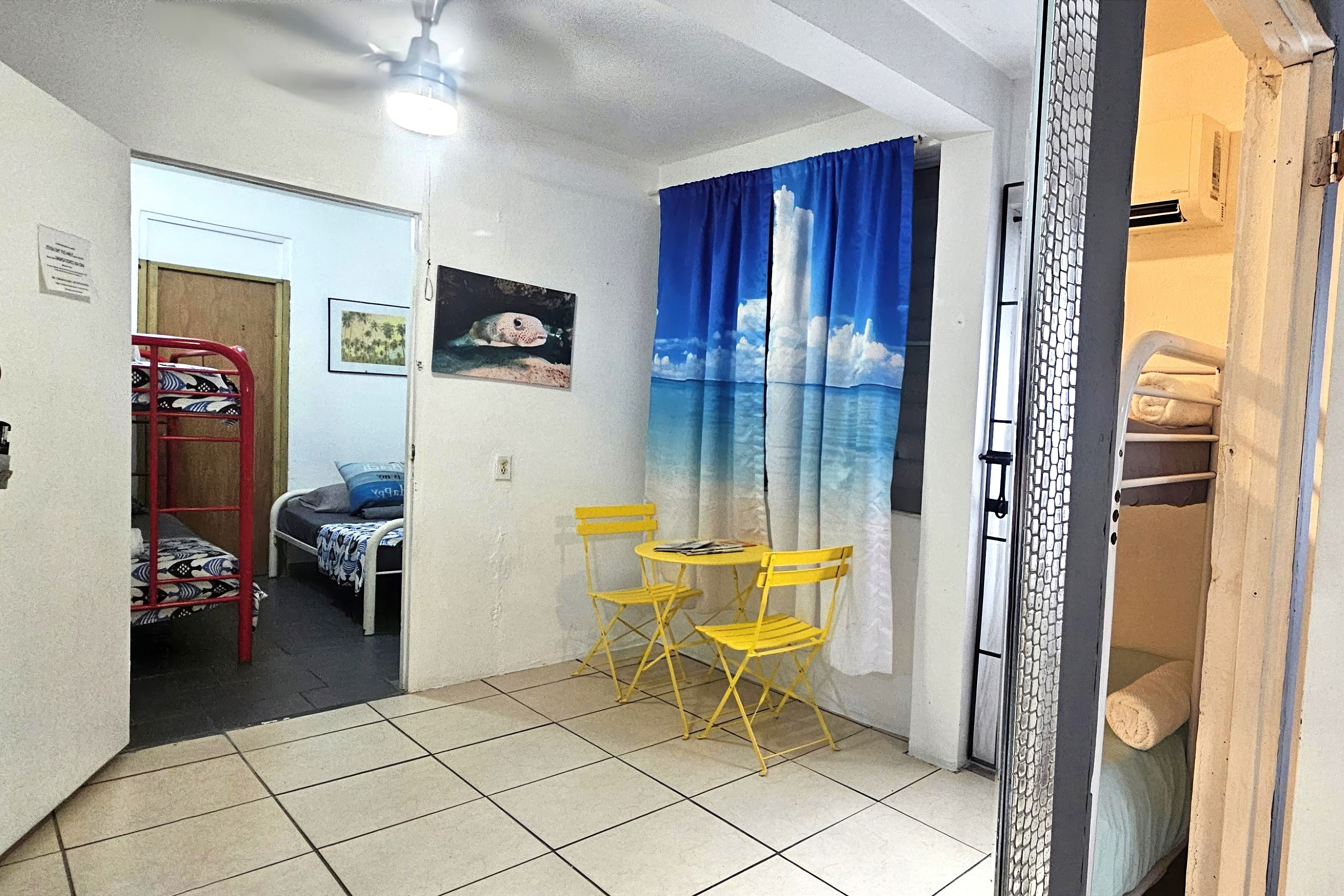 The space accommodates up to 7 guests and includes 2 bedrooms, 1 bathroom, a kitchen, and a simple common area. Bedroom 1: 1 queen bed + 1 bunk bed (2 twin beds) Bedroom 2: 1 bunk bed (2 twin beds) + 1 twin bed This stay works especially well for short getaways, families, and groups planning to spend most of their time enjoying the beaches, restaurants, and tours around Vieques. Please note: this is a modest, functional property in a lively central area, not a luxury or boutique stay.